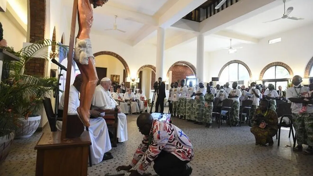 Lo explicó Francisco con la parábola de los diamantes manchados de sangre. Lo escenificó, recibiendo a las víctimas de la guerra del Este de la RDC, que depositaron ante el crucifijo y al lado del Papa los machetes con los que asesinaron a sus familiares.
