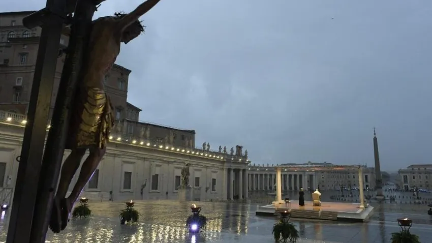 Oración casi milenarista del Papa sólo, ante el Cristo de la Peste, un una Plaza de San Pedro vacía