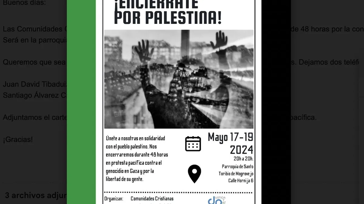 Las Comunidades Cristianas Populares de Valladolid estamos organizando un encierro de 48 horas por la concienciación del genocidio en Palestina y su liberación. Será en la parroquia de Santo Toribio de Mogrovejo en el barrio de las Delicias.