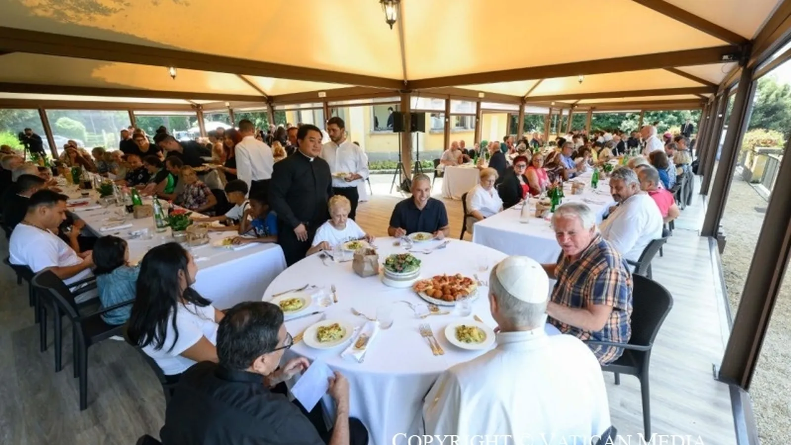 En estos jardines, que forman parte del palacio apostólico, se instaló un amplio cenador donde fueron acomodados los 110 invitados, en su mayoría personas pobres asistidas por la diócesis de Albano Laziale, y junto los que almorzó León XIV.