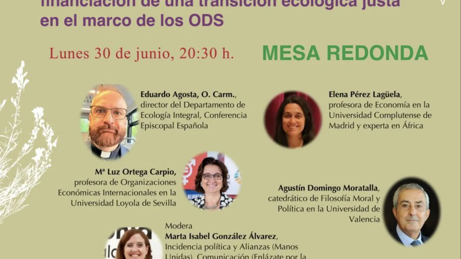 Con Eduardo Agosta Scarel (CEE-Director Ecología Integral y Doctor en Ciencias de la Atmósfera y los Océanos), Mª Luz Ortega Carpio (Dra en Económicas y Empresariales, profesora de Organizaciones Económicas Internacionales en la Universidad Loyola de Sevilla), Agustín Domingo Moratalla (Catedrático de Filosofía Moral y Política en la Universidad de Valencia y miembro de la Grupo de Coordinación de La Economía de Francisco-Eo) y Elena Pérez Lagüela (Doctora en Economía, Profesora de Economía en la UCM y experta en África). Presentado y moderado por Marta Isabel González (Manos Unidas, Enlázate por la Justicia y EoF).