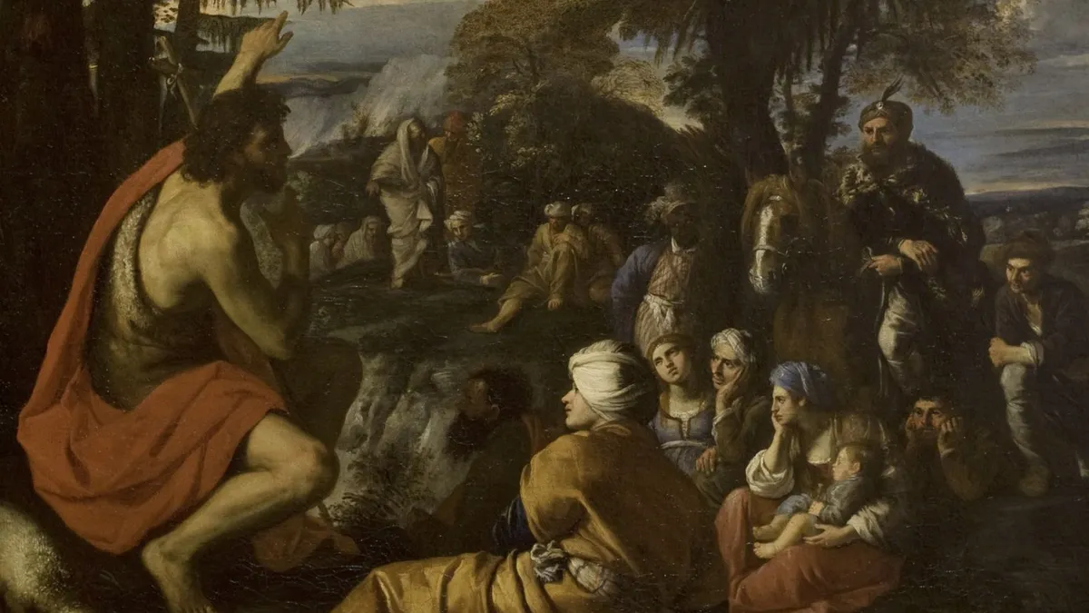 Pero su soledad y su absoluta originalidad contrastan con el panorama que tiene ante sí: se ve gente sin número que se agolpa en su dirección. Una ola de multitudes surca el desierto en dirección al río. Él no las mira, no las ve venir, sino que realiza sus gestos repetitivos de inmersión en el agua del río Jordán: una persona cada vez.