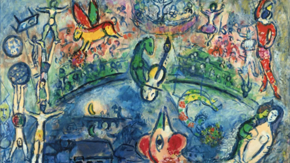 Representa una pista de circo, que para Chagall -uno de los pintores favoritos de Bergoglio- es un espejo de su tiempo. En el lienzo, acróbatas, malabaristas y músicos, trapecistas y escuderos se turnan en una pista colorida, destilando una atmósfera alegre. En el centro, la figura zoomorfa de un violonchelista se enfrenta a un gallo rojo con el ojo muy abierto, el único que mira al espectador, interpelándole.