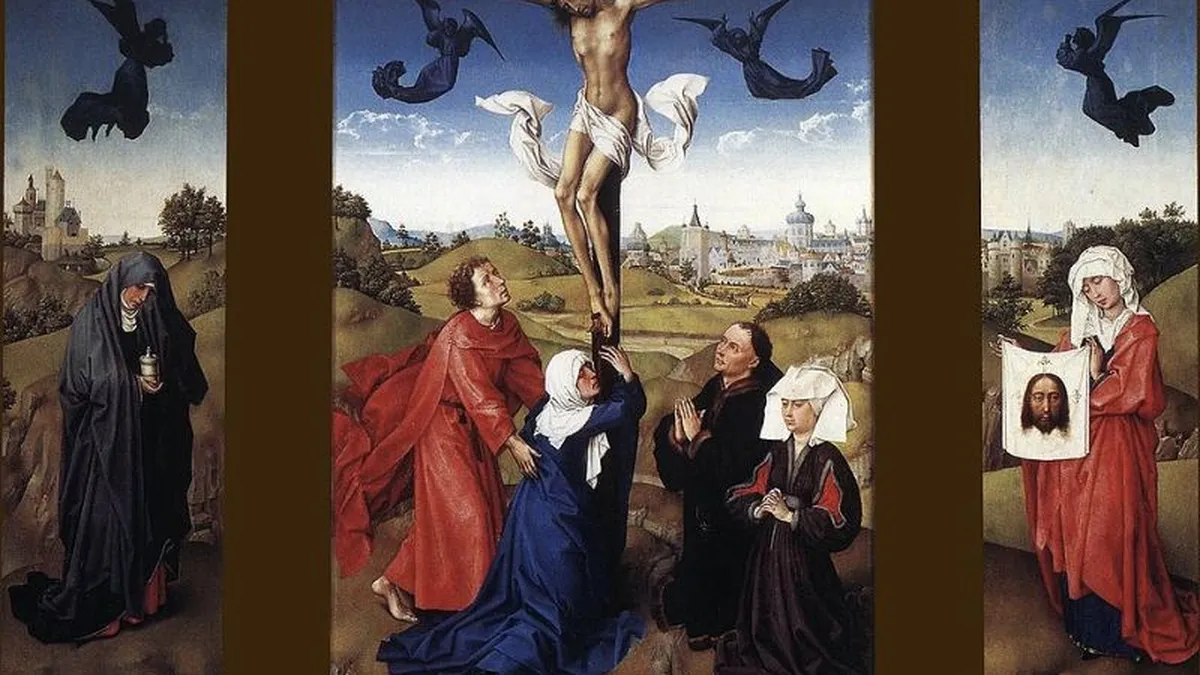 Llega la tarde con sus colores, sus matices, su oscuridad inexorable, aunque dulce. Está a punto de comenzar el sábado, el día de descanso, cuando toda actividad se detiene y el silencio se convierte en ley. Los cuerpos de Jesús y de los otros dos están elevados en las cruces hacia el cielo. La muerte une el polvo y las nubes. No hay más tiempo. Esos cadáveres deben ser retirados antes de que la oscuridad imponga la quietud: el sábado toda actividad está prohibida. La prisa del tiempo se superpone a la muerte. La cruz, tan inexorable, ahora impone urgencia.