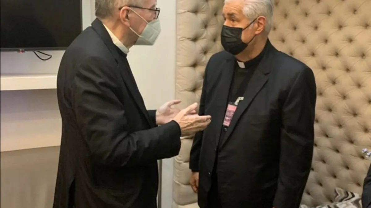Parolin fue recibido por el presidente de la Conferencia del Episcopado Mexicano, Rogelio Cabrera López y el secretario general de los obispos de México, el auxiliar de Monterrey, Alfonso Miranda Guardiola. Según se divulgó en redes sociales, Cabrera López y Miranda Guardiola regalaron al Secretario de Estado un ejemplar de la obra histórica “Quadripartita Terrarum Orbe: 500 años de Evangelización” editada por la CEM, la Universidad Nacional Autónoma de México y Buena Prensa.