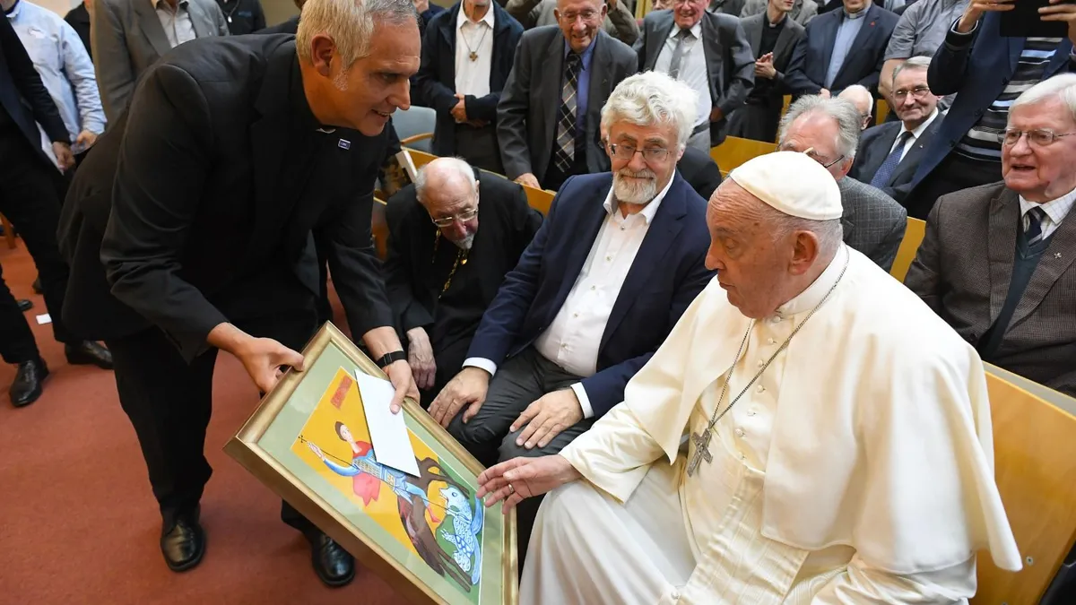 En el encuentro con el Papa tuvimos la oportunidad de tratar el tema de las migraciones en nuestro contexto europeo. Los niños de uno de nuestros albergues del JRS en Ucrania habían pintado un cuadro de S. Jorge, el patrón de Lviv, que dedicaron al Papa Francisco, y Anastasia, una niña refugiada de 10 años natural de Kherson, le escribió una carta en nombre de todos.