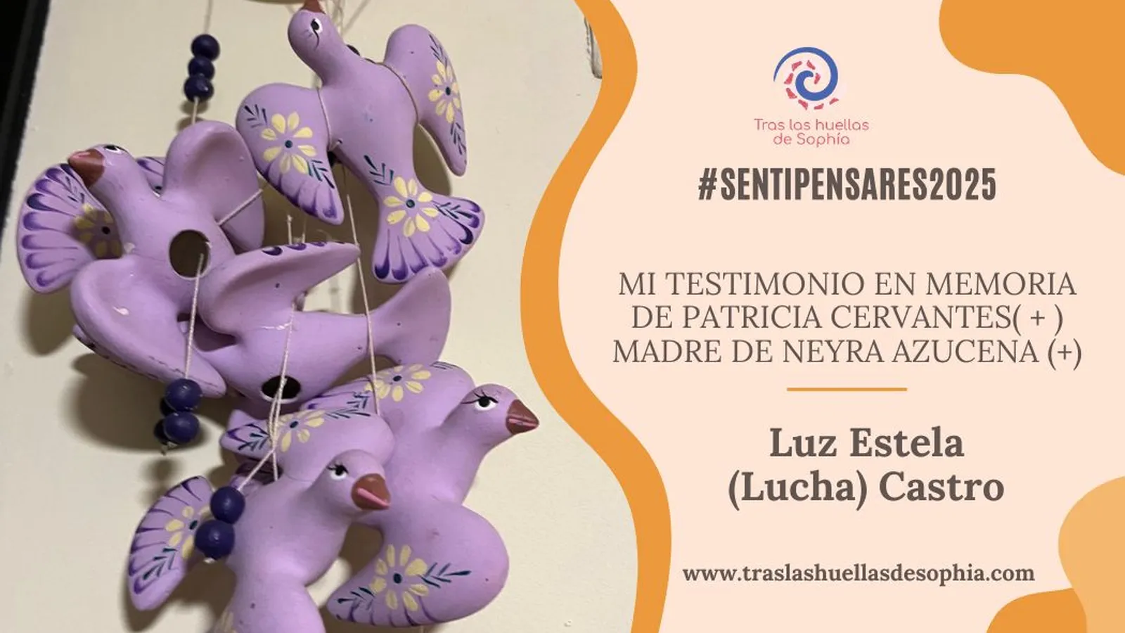 En mi casa de Barcelona, querida Paty, traje conmigo después de vender la de Chihuahua aquellos objetos más simbólicos y amados. Entre ellos cuelga en mi sala un pequeño enjambre de palomas moradas que compré en un mercado de México cuando fuimos juntas con las madres de JPNH al Zócalo. Para mí representan a las jóvenes víctimas de feminicidio, de desaparición forzada y a la lucha de sus madres. Una de esas palomas es tu hija, Neyra Azucena, encontrada asesinada en los cuernos de la luna. Desde entonces esas palomas me recuerdan a ti y al dolor transformado en lucha que nos convocó a caminar juntas.