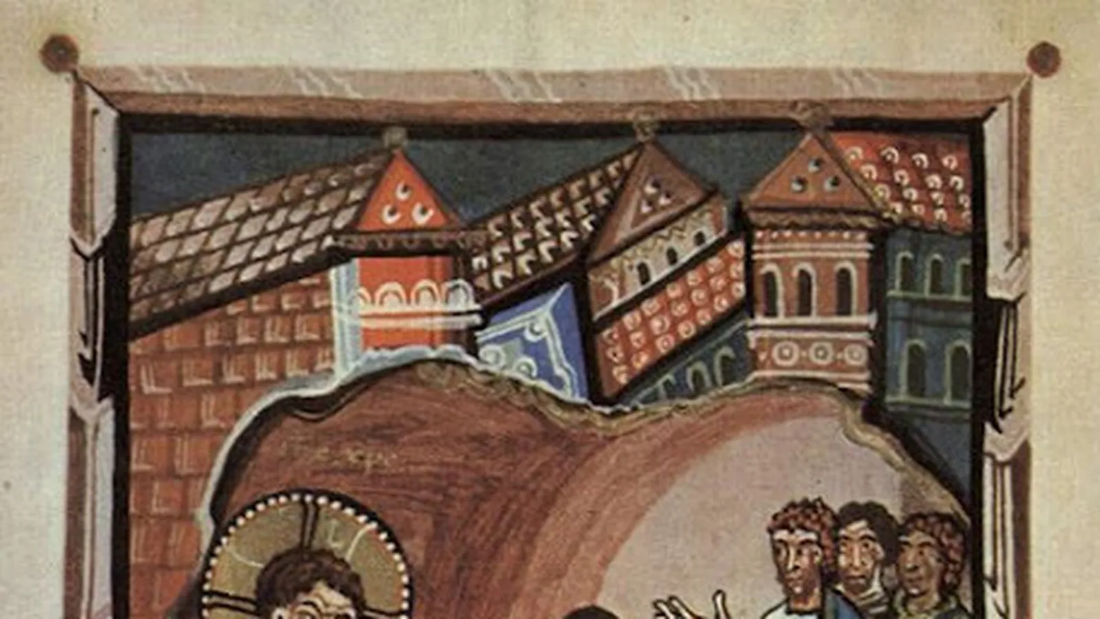 Curación de la suegra de Pedro, ilustración de la abadesa Hitda de Meschede (Siglo X) en el “Códex Hitda” que se conserva en la biblioteca regional de Hessische, Darmstadt, Alemania tomada de https://parroquiadefatimamiraflores.blogspot.com/2017/09/curacion-de-la-suegra-de-pedro-lc-4-38.html