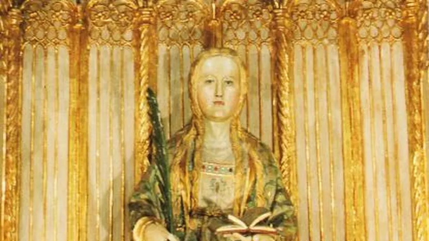 Ante esta negativa por parte de la joven fue encarcelada y sometida a tortura. Finalmente, con 18 años, fue decapitada el 16 de febrero del año 304. Se cuenta que estando en la cárcel se le aparece el demonio bajo la apariencia de un hermoso ángel, para convencerla de que no debía dejar que destruyeran la belleza de su cuerpo. Ella logra desenmascararle y entonces el ángel se convierte en una bestia deforme, a quien la joven hace confesar su perfidia, al echarle al cuello una de las cadenas con las que estaba sujeta, por eso se la representa humillando al monstruo bajo sus pies.