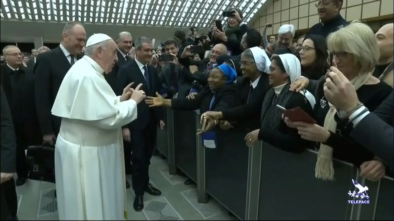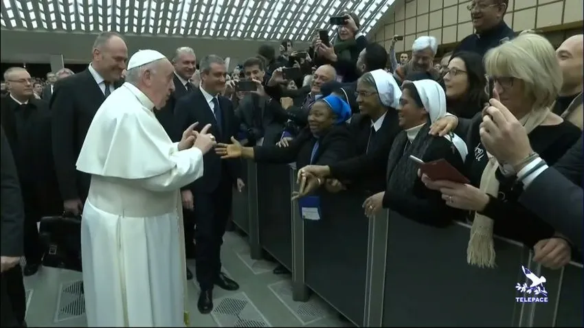 En el pasillo central del aula Pablo VI donde se celebró la audiencia general, mientras saludaba como es habitual a los fieles, Francisco se detuvo ante unas monjas y al ver a una de ellas muy agitada que gritaba: "Viva el Papa" le dijo sonriendo: "tú muerdes".