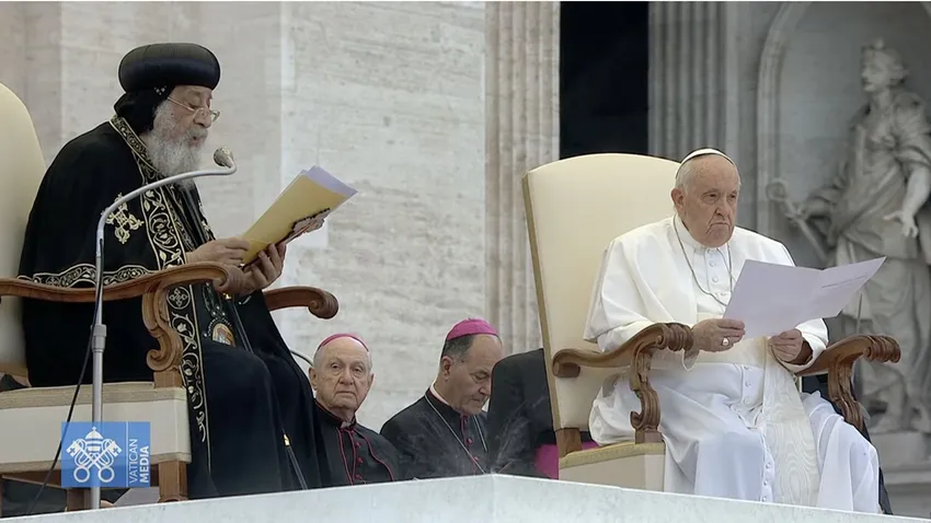 Histórica audiencia general la de este miércoles, 10 de mayo, en una Plaza de San Pedro regada por la lluvia, donde se han juntado dos papas, el de la Iglesia católica, y Tawadros II, papa de Alejandría y patriarca de la sede de San Marcos, juntos de nuevo diez años después de su primer encuentro y a medio siglo de otra histórica efeméride, la del encuentro entre sus respectivos antecesores, Pablo VI y Shenouda III, paso histórico en el reconocimiento de ambas realidades eclesiales.
