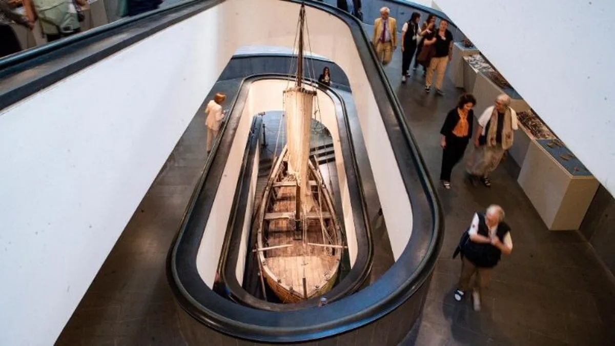 "Reproduce una barca encontrada a orillas del lago de Tiberíades en 1986, durante una repentina bajada de las aguas, bien conservada gracias al barro del fondo marino que la cubría y datada en la segunda mitad del siglo I a.C., época de la predicación de Jesús".
