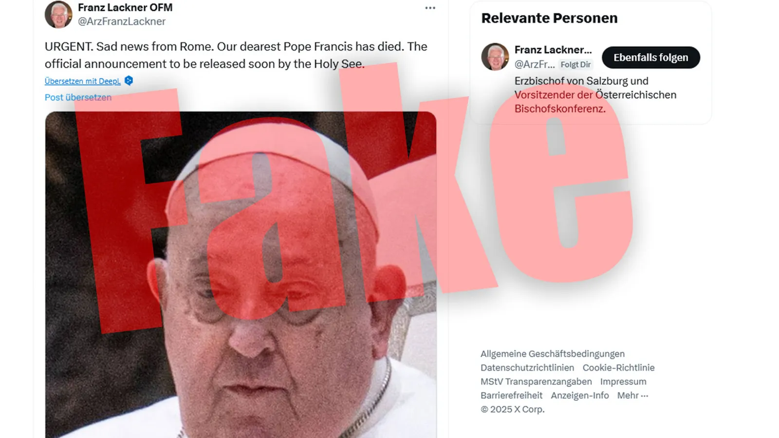 Y lo ha hecho, como suele ser habitual en él, suplantando la cuenta de un alto prelado, ni más ni menos que el arzobispo de Salzburgo, Franz Lackner, presidente de la Conferencia episcopal austríaca. El perfil, que ya ha sido eliminado por el autodenominado 'maestro de las mentiras', mostraba esta medianoche un mensaje con una foto de Bergoglio y el anuncio de su fallecimiento: