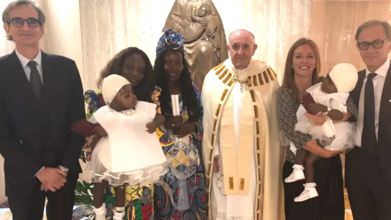 La información la facilitó hoy Antoinette Montaigne, una política centroafricana y exministra de Comunicación, comprometida en el país en la Academia para la Paz y que colgó una foto en las redes sociales del papa con los elementos para el bautizo y la familia de las niñas.