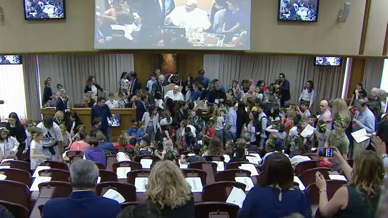 Francisco llegó antes de lo previsto al Aula Nueva del Sínodo, donde se encontraba un variado público de ponentes, científicos, y expertos de distintos ámbitos de la sociedad, y abrió una tierna conversación con los más pequeños, invitándolos a reflexionar sobre diversos temas importantes, en los que demostraron su espontaneidad. Este evento marca el camino de preparación hacia la I Jornada Mundial de los Niños, programada del 25 al 26 de mayo en Roma y en el Vaticano, en el que se espera que 72.000 niños y acompañantes acudan al Estadio Olímpico, como anunció el padre Enzo Fortunato, coordinador de este acontecimiento.