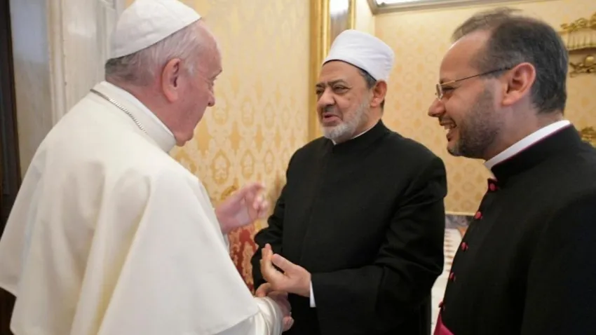 Junto al Santo Padre, se encontraba Su Eminencia el cardenal Miguel Ángel Ayuso Guixot, Presidente del Pontificio Consejo para el Diálogo Interreligioso y Mons. Yoannis Lahzi Gaid, secretario del Pontífice.