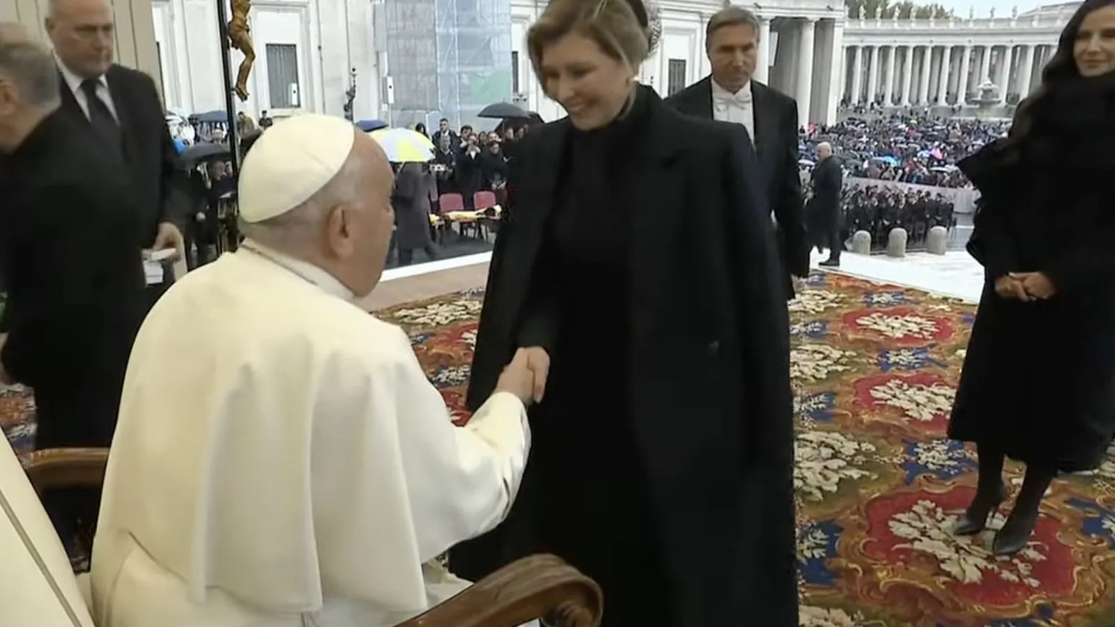 Posteriormente, a la hora de los saludos personales, el Papa estrechó la mano de Olena Zelenska, la esposa del presidente de Ucrania, Vlodimir Zelensky, a quien se pudo ver emocionada durante algunos momentos de la audiencia general.