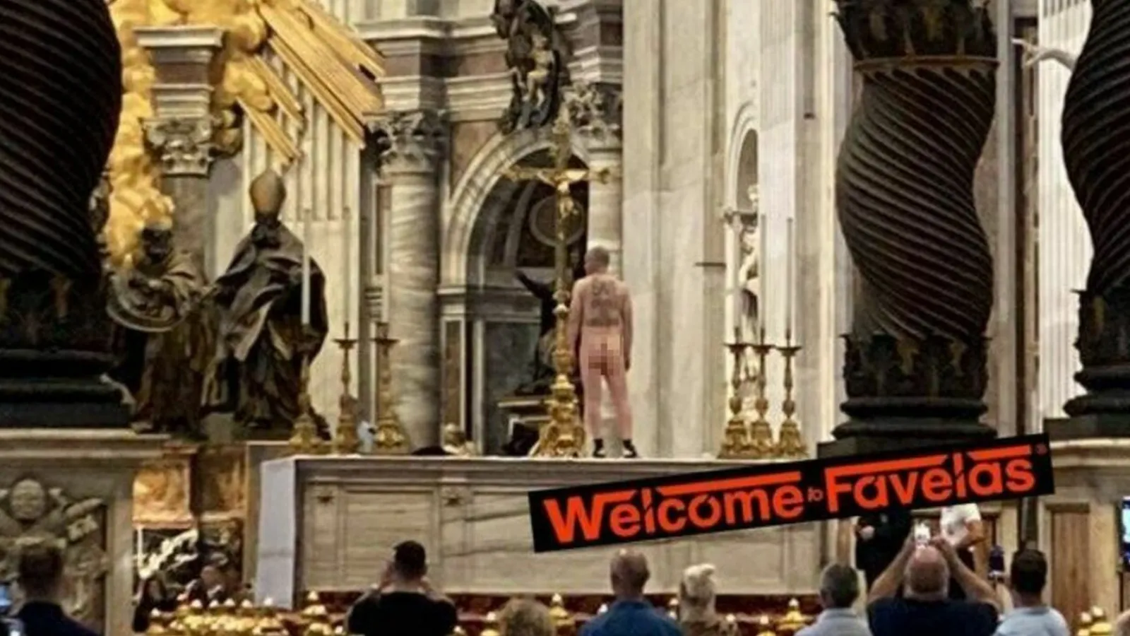 Un hombre logró este jueves saltar hasta el altar principal de la basílica de San Pedro, en el Vaticano, y desnudarse completamente para mostrar unas pinturas en su cuerpo contra la guerra de Ucrania.
