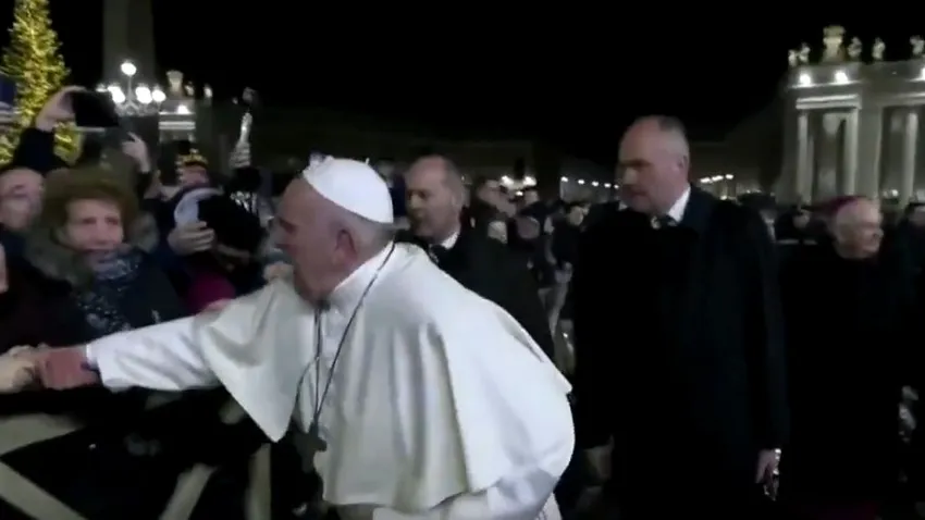 El manotazo del papa Francisco a una mujer que lo retenía con fuerza durante la noche vieja en la plaza de San Pedro desató todo un debate este jueves sobre los peligros que corre el pontífice argentino durante los actos multitudinarios. El incidente, cuyas imágenes han dado la vuelta al mundo, no sólo muestran al Papa muy irritado sino que también han puesto en cuestión el esquema de seguridad para protegerlo.