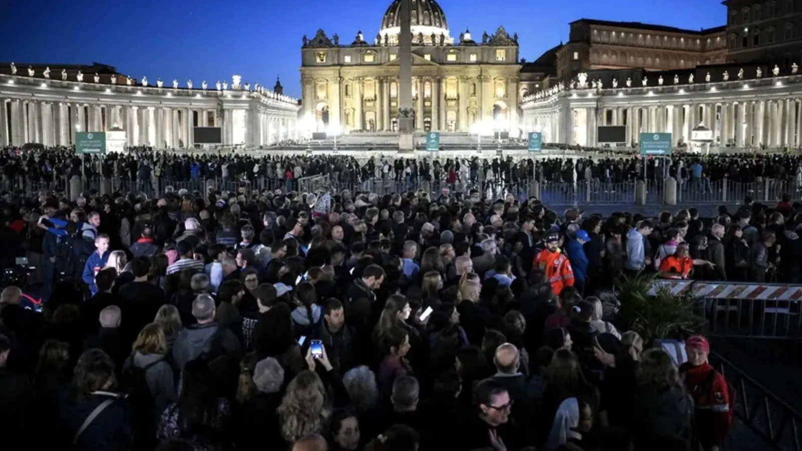 El gran reloj en lo alto de la fachada de la basílica de San Pedro del Vaticano marca la medianoche pero una multitud de personas hace fila en la plaza para acceder al templo: en su interior yace un papa difunto, Francisco, al que miles de personas rinden tributo estos días hasta su funeral del sábado.