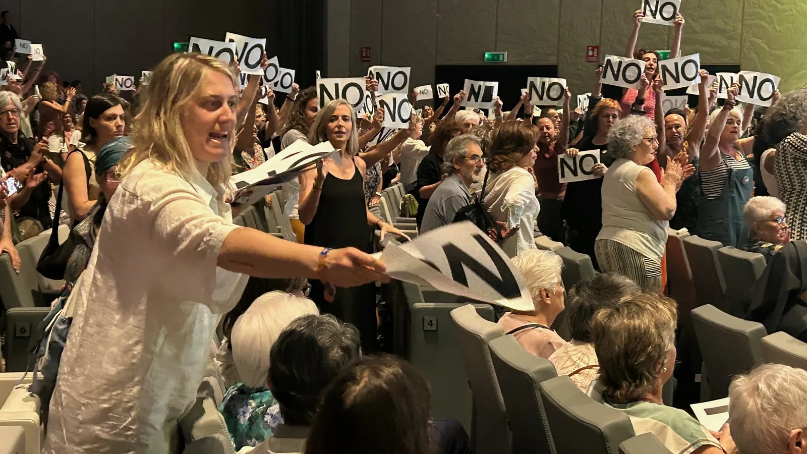 Fue en ese momento cuando también de los bolsos de algunas de las asistentes salieron papeles con un NO escrito en ellos y comenzaron a repartirse por la sala, también hacia la parte reservada a los representantes de las congregaciones religiosas, que, sin levantase del sitio, no lo recogieron. En sus caras se veía la conmoción y hubo también lágrimas entre las religiosas que había subido al estrado para pedir perdón.