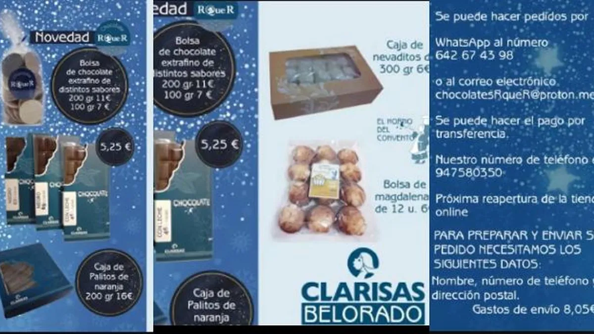 De momento, los dulces sólo pueden encargarse a través del fijo del convento, un número de whatsapp o un correo electrónico chocolatesRqueR@proton.me, y se admite el pago por transferencia, a la 'Asociación Monasterio de Santa Clara Belorado'. "Próxima apertura de la tienda on line", recalcan las ex religiosas anunciando su famosa 'Artesanía monacal'.