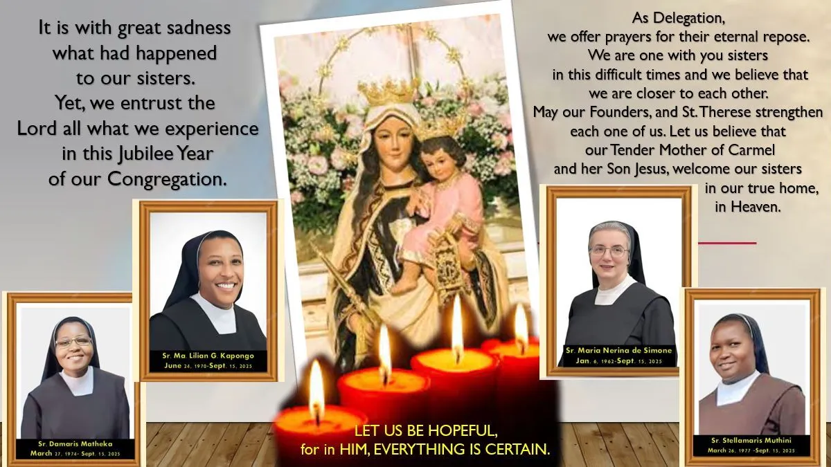 Este lunes, en Tanzania, en la misión de Mwanza, perdieron trágicamente la vida la superiora general de las Carmelitas Misioneras de Santa Teresita del Niño Jesús, sor Lilian Gladson Kapongo, junto con sor Maria Nerina De Simone, consejera y secretaria general, sor Damaris Matheka, consejera provincial de la Provincia de África Oriental, sor Stellamaris Muthini y el conductor del vehículo, llamado Bonifasi.